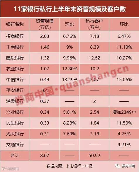 据券商中国记者统计,在上半年报中,有11家银行披露私行AUM,共管理私行客户资产总规模约为8.07万亿元。
