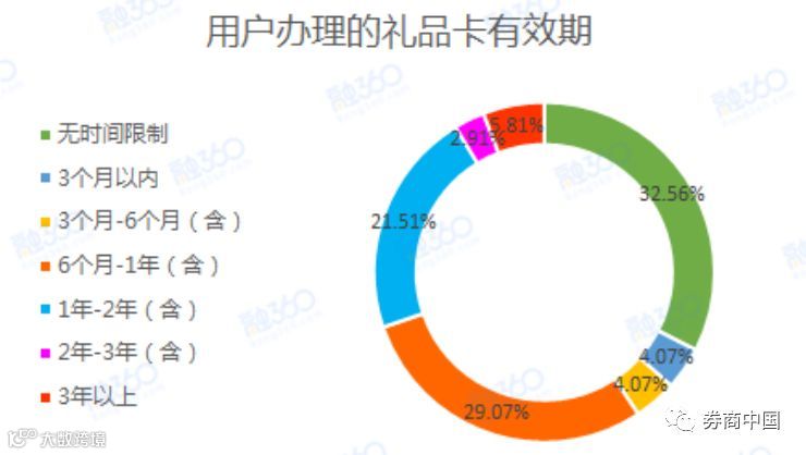 融360调查发现,很多礼品卡的有效期都不符合规定。调查数据显示,只有32.56%的用户办理的礼品卡没有时间限制,以及5.81%的用户礼品卡有效期在3年以上。其余高达61.63%的用户办理的礼品卡,有效期都在3年以内,甚至有8.14%的用户礼品卡有效期不足6个月。
