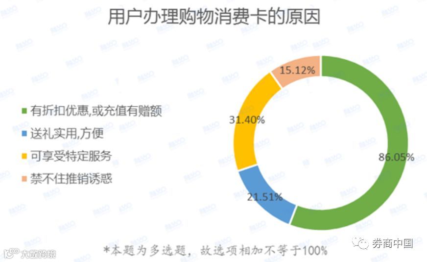 选择办理这些形形色色的预付卡的原因是什么呢?调查显示,有86.05%的调查对象表示,办卡主要是因为有折扣优惠或充值有赠额,也有15.12%的受访者表示因为禁不住推销诱惑。