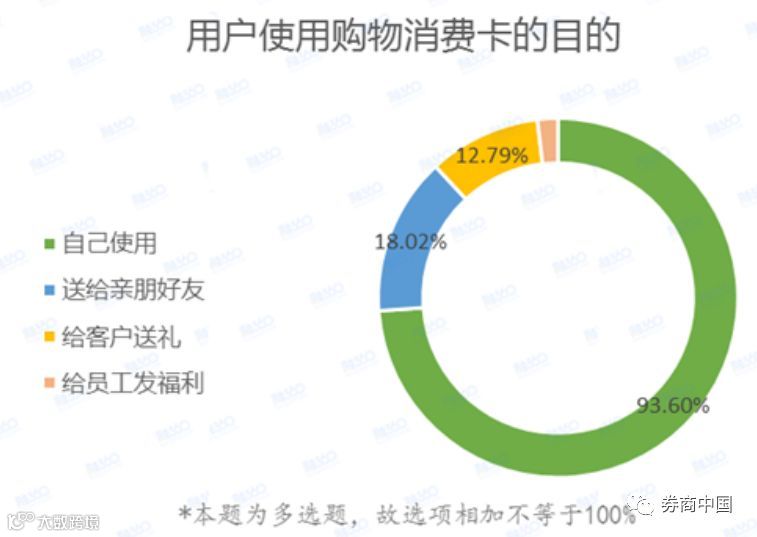 从用户使用购物消费卡的目的来看,93.6%的受访者表示办卡是为了自己消费;而办卡是为了“给客户送礼”和“送给亲朋好友”的分别只占12.79%和18.02%。