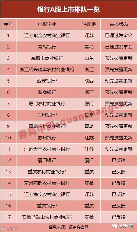随着青岛银行成功过会,A股IPO排队候审的银行变更为15家。其中,9家中小银行已进入“预披露更新”状态,厦门银行、重庆农商行等6家银行目前处于“已反馈”状态。郑州银行、江苏紫金农商行和青岛银行过会待领取发行批文。