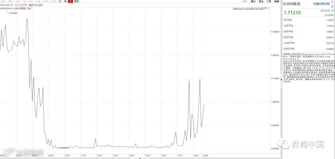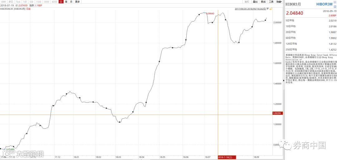 从上图的香港银行同业拆借利率Hibor来看,在美元加息的环境下,香港3个月的Hibor已经升至2%以上的水平,直逼前期6月底高点2.09%。