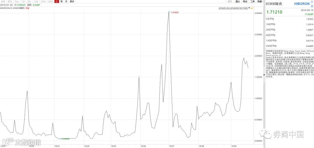 从隔夜资金拆借利率来看,港币资金价格也在持续走高。