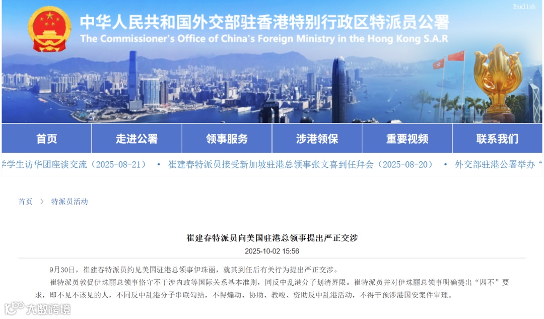9月30日,崔建春特派员约见美国驻港总领事伊珠丽,就其到任后有关行为提出严正交涉。