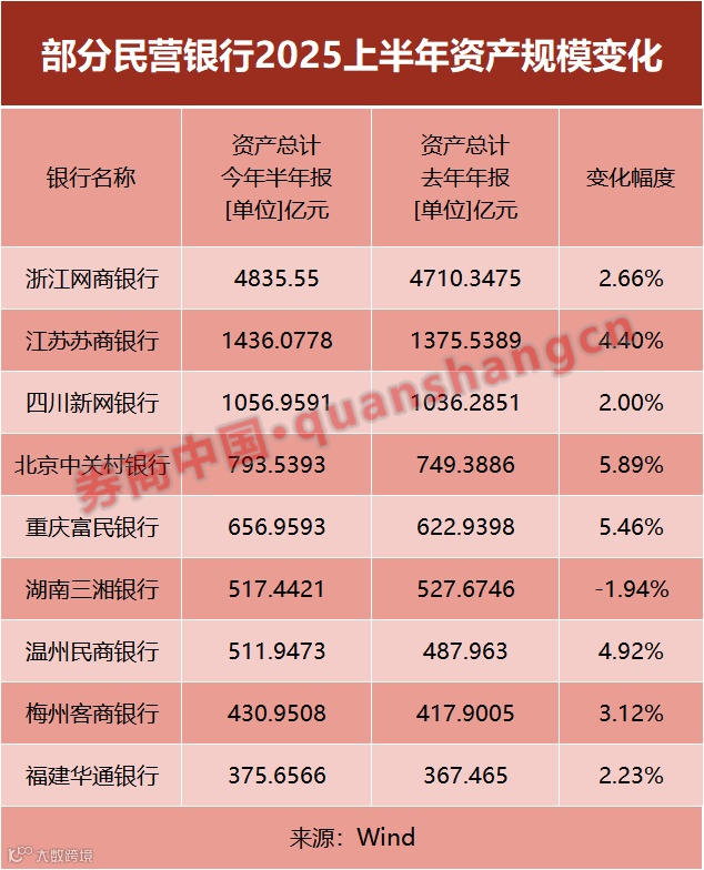 2025年上半年,多数民营银行资产规模仍保持增长趋势,但增速有所放缓,不同梯队的规模差距较为明显。