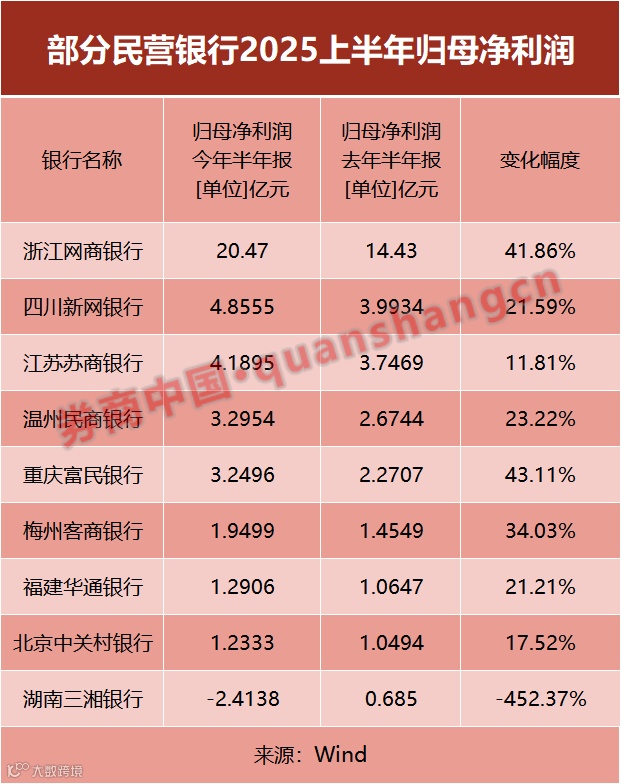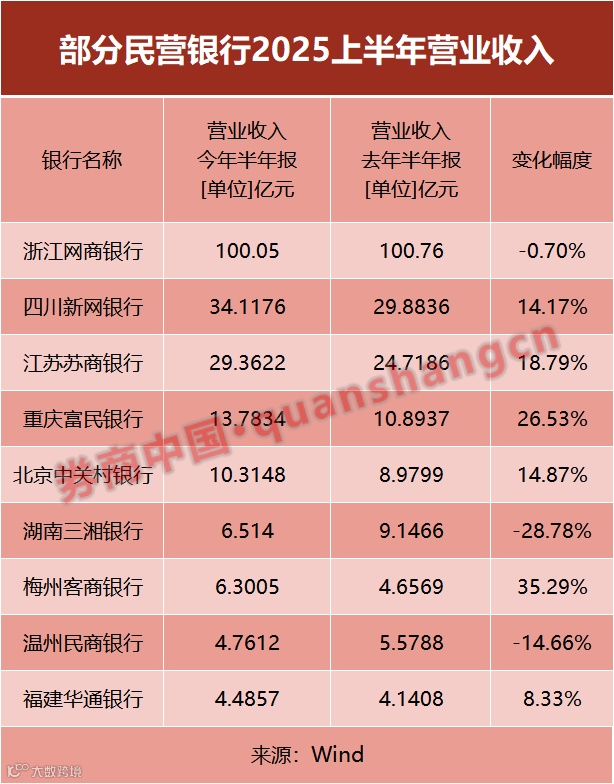 半年报季落下帷幕,多家民营银行2025年半年度业绩也随上市公司财报一齐亮相。截至目前,浙江网商银行、四川新网银行、江苏苏商银行、重庆富民银行等9家民营银行上半年经营数据已经公布。
