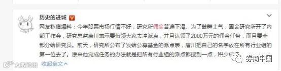 这则网传的爆料声称:“今年股票市场行情不好,研究所佣金普遍下滑。为了鼓舞士气,国金研究所开了内部工作会,研究总监唐川表示要带领大家去冲派点,并且认领了2000万元的佣金任务,而且要全部分给研究员。前天,研究所公布了发给公募基金的派点表,唐川把自己的名字放在所有行业组的第一位去了。原来他完成任务的办法就是把所有行业组的派点都搜刮一点,积少成多。”