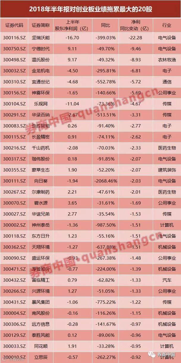就各家公司来看,坚瑞沃能、宁德时代、温氏股份的拖累程度最大,今年半年报净利润较去年同期分别减少净利润22.28亿元、9.46亿元和8.93亿元,合计减少净利润40.67亿元,占今年创业板净利润的7.5%。