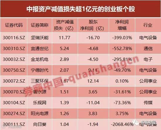 据券商中国记者统计,今年上半年共有9家创业板上市公司报告了超1亿元的资产减值损失,有4家的资产减值损失超2亿元,分别是坚瑞沃能、宜通世纪、金龙机电和宁德时代,资产减值损失分别为11.77亿元、5.24亿元、2.89亿元和2.07亿元。