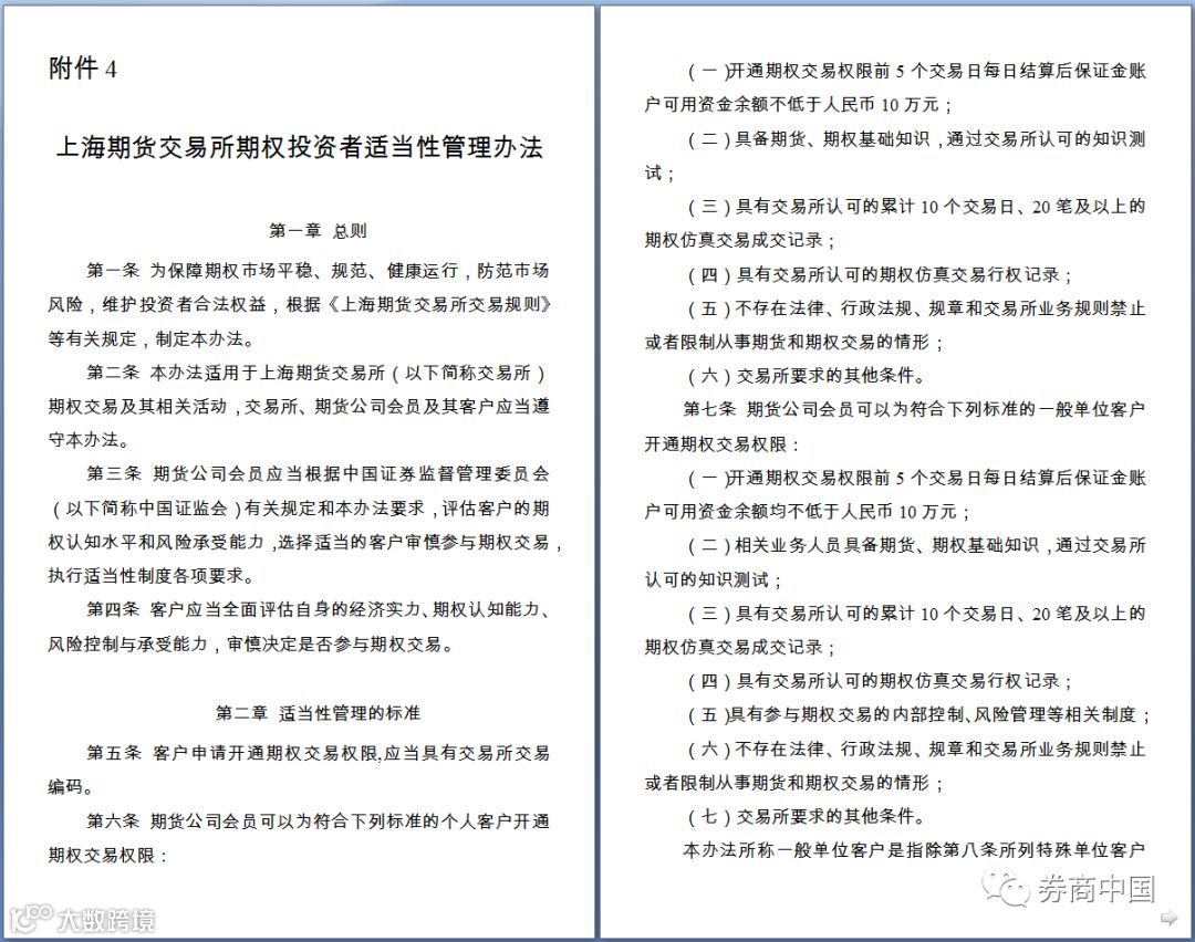 同时,为保障期权市场平稳、规范、健康运行,防范市场风险,维护投资者合法权益,上期所对期权投资者实施适当性管理制度,在《上海期货交易所期权投资者适当性管理办法》中,上期所对投资者适当性管理的标准及实施等作了明确规定。