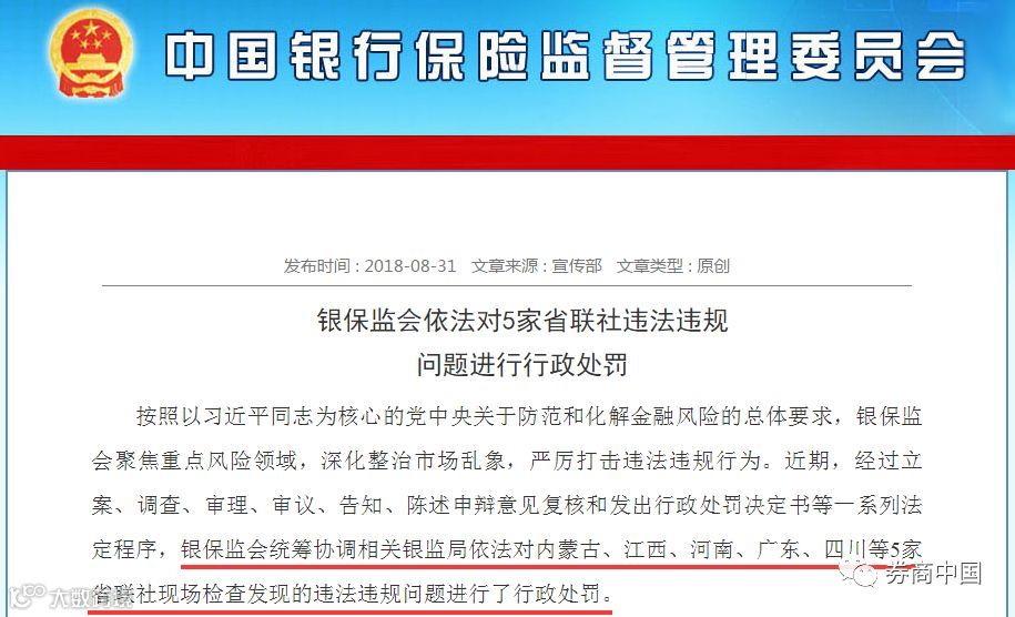 8月31日,银保监会发布公告称,经过立案、调查、审理、审议、告知、陈述申辩意见复核和发出行政处罚决定书等一系列法定程序,银保监会统筹协调相关银监局依法对内蒙古、江西、河南、广东、四川等5家省联社现场检查发现的违法违规问题进行了行政处罚。
