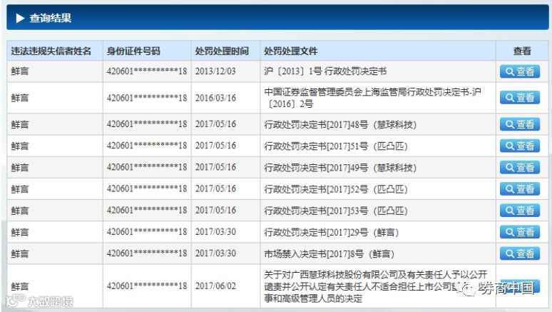 最终,监管部门对鲜言实际控制的慧球科技及其主要负责人开出两张张信息披露违法违规罚单。