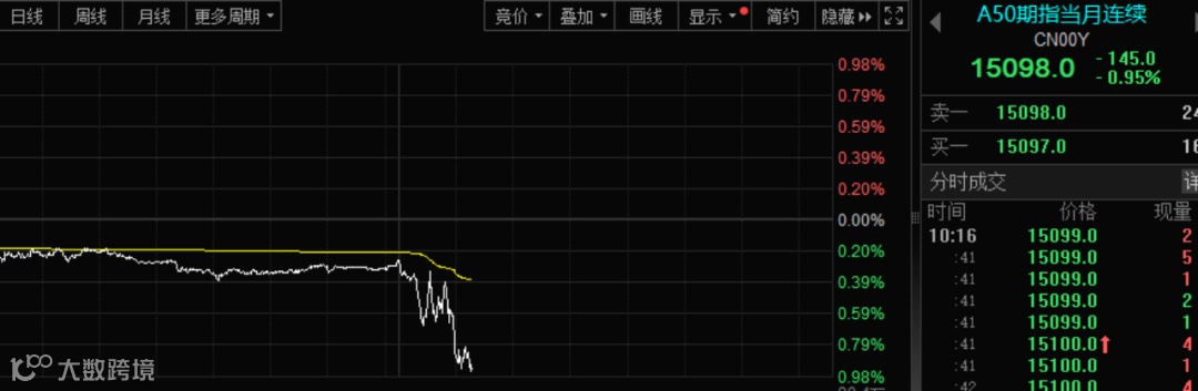 继昨晚下跌之后,A50早盘出现持续跳水行情,跌幅一度扩大超1%。恒指期货亦显著杀跌,港股全线走弱。