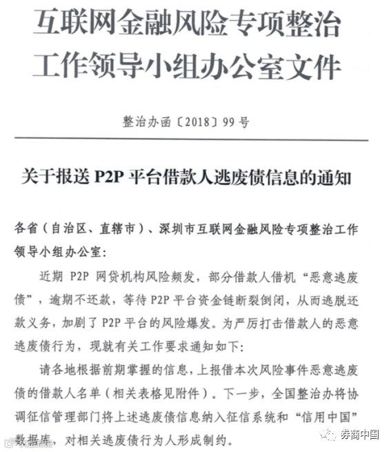 互联网金融风险专项整治工作领导小组办公室于8月8日向各省下发《关于报送P2P平台借款人逃废债信息的通知》,通知表示,全国互金整治办将协调征信管理部门将上述逃废债信息纳入征信系统和“信用中国”数据库,对相关逃废债行为人形成制约。互金整治办要求,各地于8月9日12时前反馈。