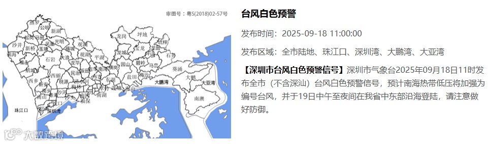 【深圳市台风白色预警信号】深圳市气象台2025年09月18日11时发布全市(不含深汕)台风白色预警信号,预计南海热带低压将加强为编号台风,并于19日中午至夜间在我省中东部沿海登陆,请注意做好防御。