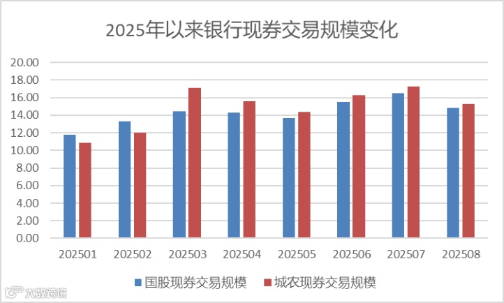 具体来看:8月,大行的现券买卖成交金额约为3.568万亿元,股份行现券买卖金额约为11.232万亿元,两者合计为14.8万亿元,较7月合计的16.49万亿元、6月合计的15.51万亿元均更低;城商行现券买卖成交金额约为10.2万亿元,农商行约为5.088万亿元,两者合计约为15.288万亿元,较7月合计的17.24万亿元、6月合计的16.3万亿元均更低。