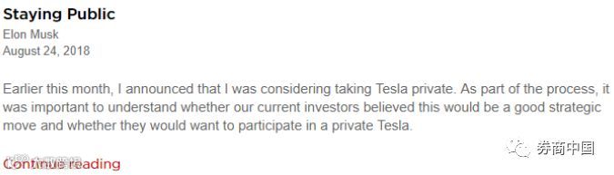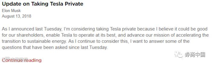 8月14日,马斯克发表关于特斯拉私有化的第二封公开信,他回答了自发布特斯拉私有化提议以来,所面对的一些问题:到目前为止发生了什么?我为何公布?我为什么说资金有保障?下一步是什么?
