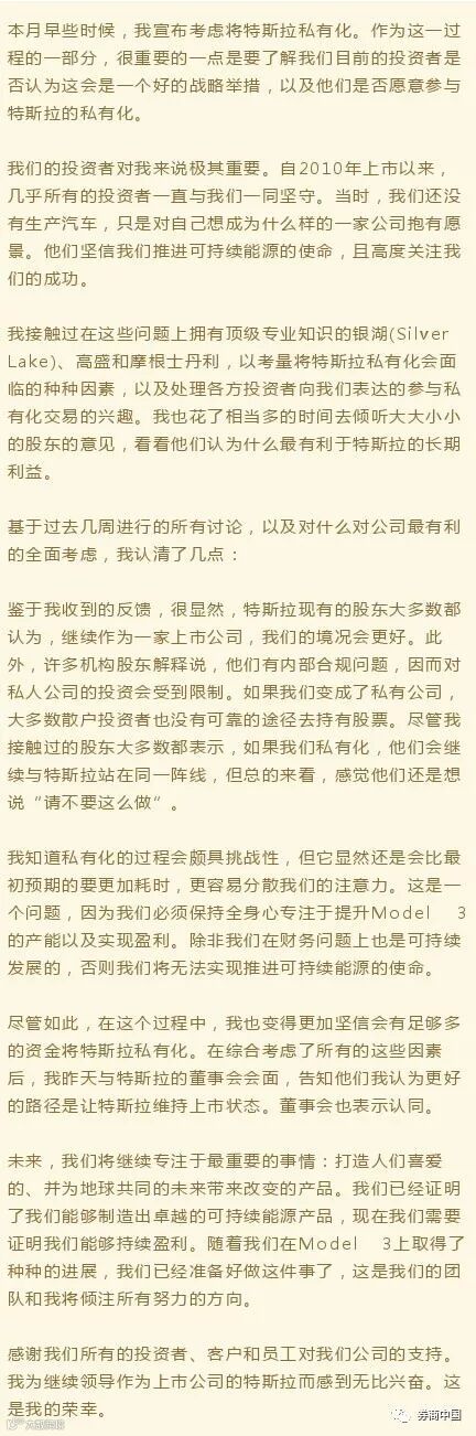今日,马斯克在特斯拉官网发表公开信,正式宣布放弃特斯拉私有化。信中表示,由于大多数股东认为继续作为一家上市公司可能会更好以及私有化过程比预期的更加耗时等,马斯克会面特斯拉董事会,提出让特斯拉维持上市状态,董事会表示认同。
