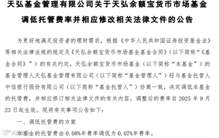 9月23日,天弘基金公告,基金管理人经与基金托管人中信银行股份有限公司协商一致,决定调低天弘余额宝货币市场基金的托管费,调整后的费率自9月23日起生效,本次调整内容为将该基金的托管费由0.08%年费率调至0.07%年费率。
