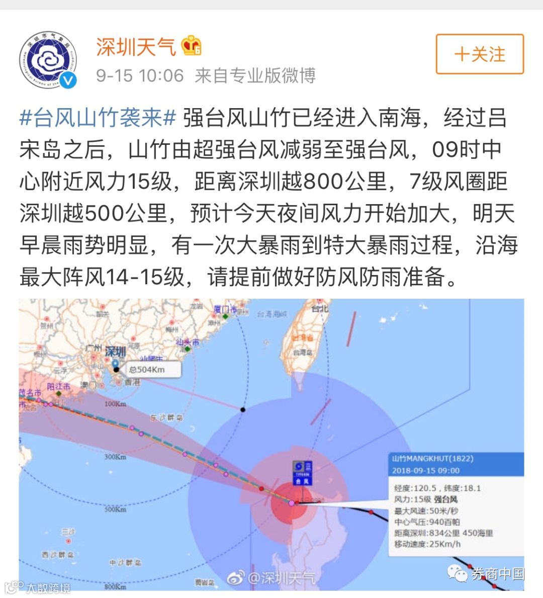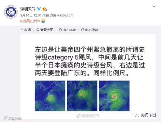 9月14日,深圳市气象局官方微博深圳天气表示,台风山竹比让美国四个州紧急撤离的“史诗级五级飓风”、让日本瘫痪的史诗级台风都还要大!