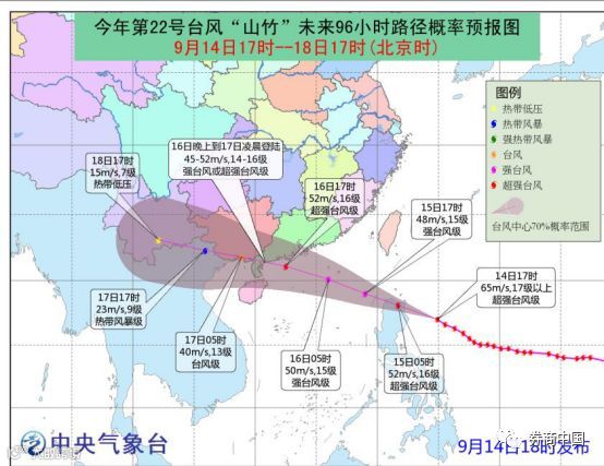 9月14日15时,中央气象台最新预报,今年第22号台风“山竹”将于9月16日夜间登陆广东西部至海南岛东北部一带沿海,登陆时强度为强台风或超强台风级(14~16级)。“山竹”很可能成为今年登陆我国最强的台风,华南地区将面临严峻考验。