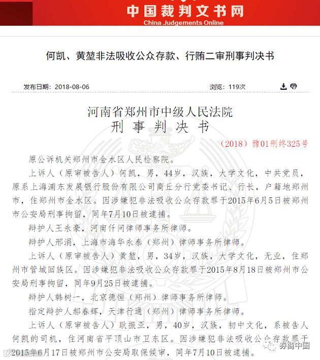 日前,中国裁判文书网披露,原浦发银行商丘分行行长何凯非法集资108.46亿元、行贿159万元一案做出二审判决:鉴于何凯在羁押期间有突出表现,获减刑1年,最终判处有期徒刑12年,并处罚金60万元。该判决为终审判决。
