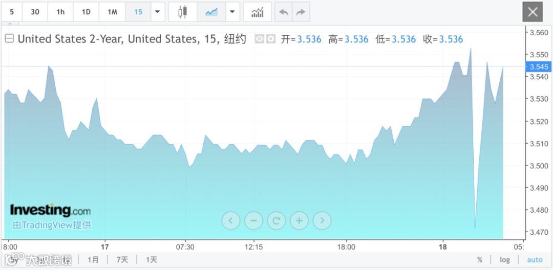 两年期美债收益率短线从3.54%一线跳水至接近3.46%的水平。在鲍威尔讲话期间,两年期美债收益率反弹至3.54%上方,完全收复美联储宣布降息以来的失地,短线形成尖锐的V形反转。