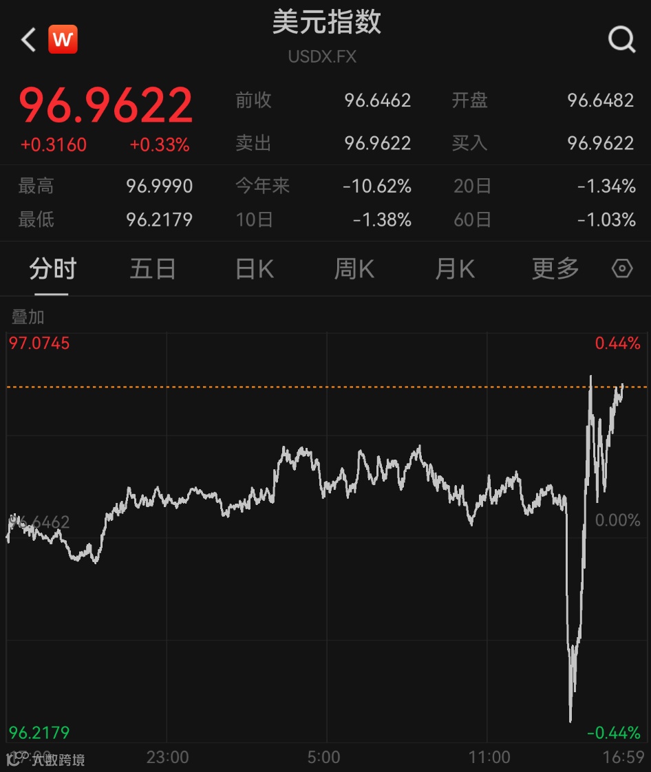 美元指数也上演大逆转,利率决议公布后直线跳水,一度跌0.44%,随后大幅拉升,由跌转涨,现涨0.33%,报96.9622。