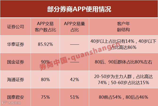 券商中国记者获悉,目前国金证券超过90%的客户均是通过APP进行交易,华泰证券也有高达85.29%的交易客户通过“涨乐财富通”进行交易。