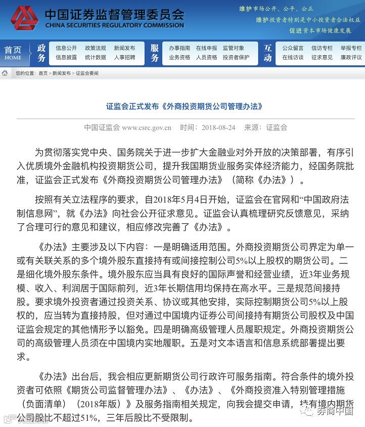 证监会今日正式发布《外商投资期货公司管理办法》,并于即日起施行。《管理办法》,明确了入股国内期货公司的适用范围、境外股东资质和持股方式等一系列细节问题。此举是对扩大金融业开发政策的延续。