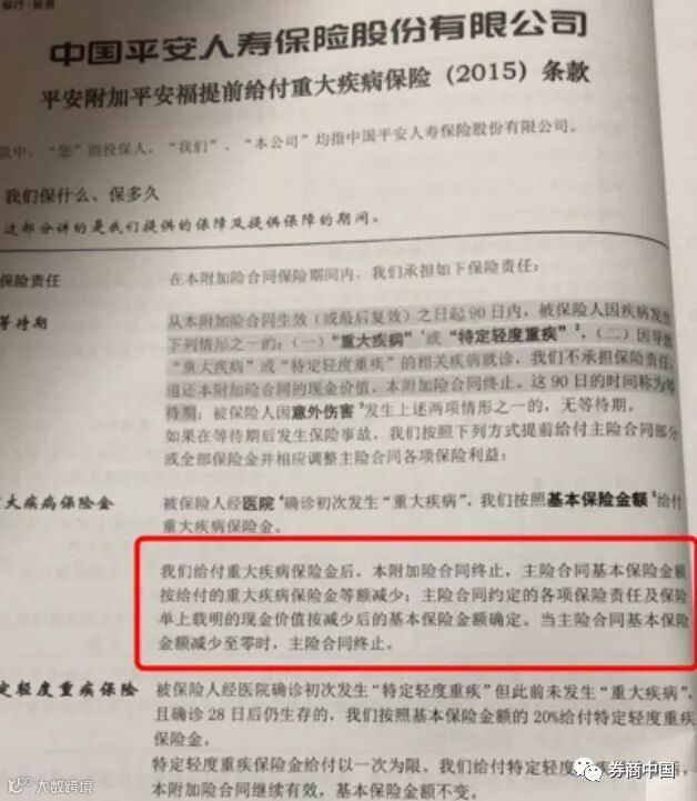 比如,券商中国记者看到一份由重大疾病主险+附加意外险组成的保险合同,主险和附加险保额都是20万。这份合同规定,附加合同效力终止的情况中包括“主合同效力终止”。一旦被保险人罹患重疾获得主险的保险金后,这份保单附加的意外险也同时失效,尽管还没“用到”,尽管也对附加意外险交了保费。对于消费者来说,购买了这份保险,想要把“主险和附加险”都用到,只有意外身故才行,只有意外身故,才会获得20万+20万=40万的保险金。