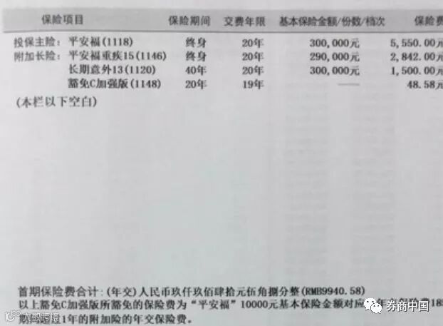 这份保险合同由一个主险附加三个长险构成,主险为平安福,附加的是平安福重疾、长期意外、豁免C加强版。其中,主险平安福保障责任是身故,保障期间终身,交费20年,基本保额30万元,保费为5550元;附加平安福重疾保障终身、交费20年、基本保额29万元、保费2842元;附加长期意外保险期间为40年、交费20年、基本保额30万、保费1500元;附加豁免C加强版保障20年、交费19年、保费48.58元。这份保险合同的首期保费合计9940.58元。