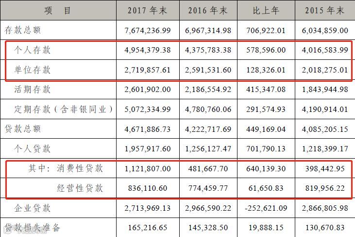 2、在2017年,个人消费性贷款比上年大增2.32倍,远高于同期个人经营性贷款的余额和增速。