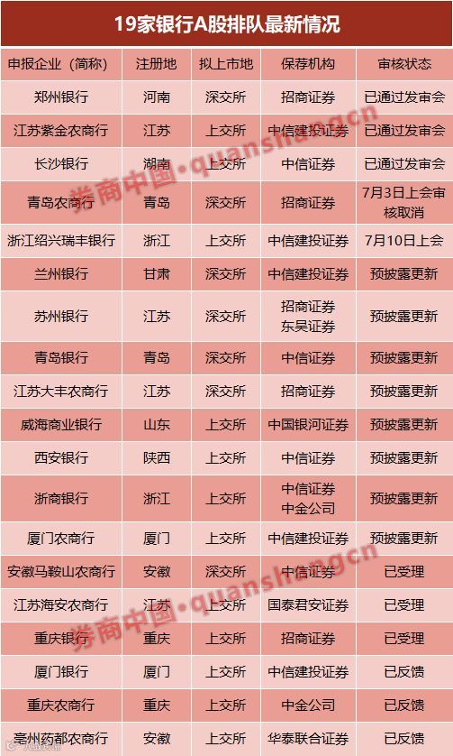 中小银行的排队速度在加快。除了近三个月已过会的郑州银行、长沙银行、紫金农商行,6月底以来,又有浙商银行预披露更新、青岛农商行公告7月3号上会(后临时公告取消审核)、厦门农商行预披露更新。