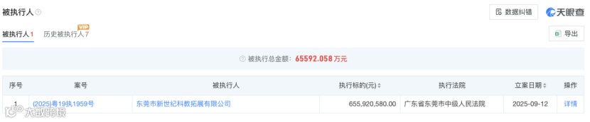 除了上述纠纷外,新世纪公司还有一单执行案件。天眼查信息显示,就在数日前(9月12日),东莞市新世纪科教拓展有限公司被广东省东莞市中级人民法院立案执行,案号为(2025)粤19执1959号,执行标的金额高达6.56亿元。这是新世纪公司今年以来标的金额最大的执行案件。