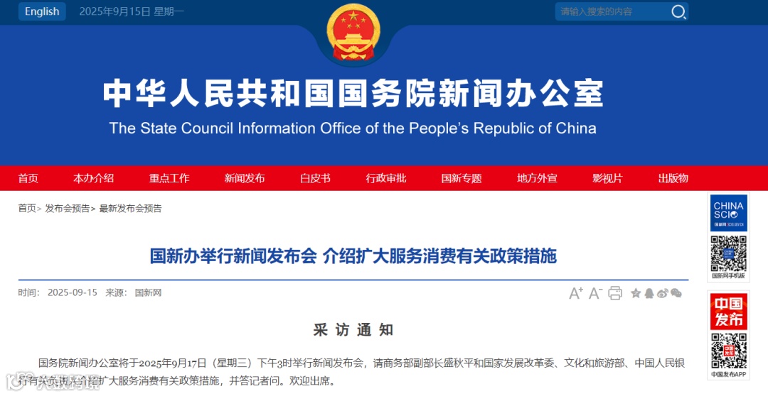据国务院新闻办公室消息,国新办将于2025年9月17日(星期三)下午3时举行新闻发布会,请商务部副部长盛秋平和国家发展改革委、文化和旅游部、中国人民银行有关负责人介绍扩大服务消费有关政策措施,并答记者问。