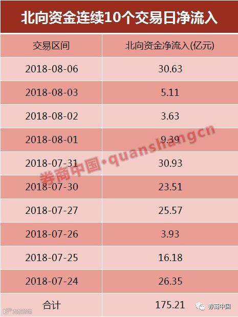 截至8月6日A股收盘,北向资金净流入30.63亿元,这已是北向资金连续第10个交易日净流入。