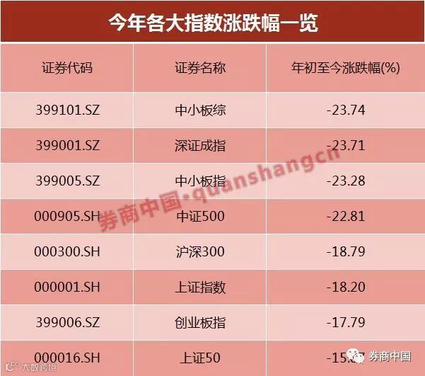 整体来看,A股市场各大指数今年均出现一定程度下跌。中小板综下跌23.74%,深成指下跌23.71%,中小板指下跌23.28%,去年表现亮眼的上证50指数今年也出现15.87%的跌幅。