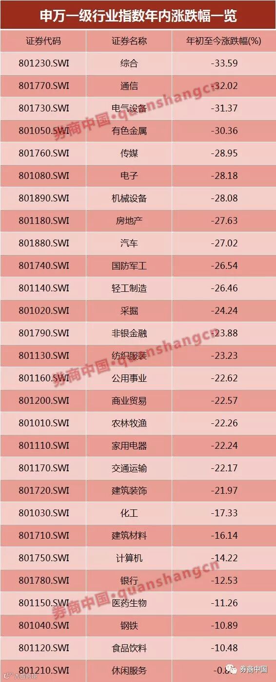 以申万一级行业指数年内表现来看,28个板块指数无一上涨。跌幅超过30%的共有4个板块,分别是综合、通信、电气设备、有色金属;跌幅在20%-30%之间的共有16个板块,分别是传媒、电子、机械设备、房地产、汽车、国防军工、轻工制造、采掘、非银金融、纺织服装、公用事业、商业贸易、农林牧渔、家用电器、交通运输、建筑装饰。