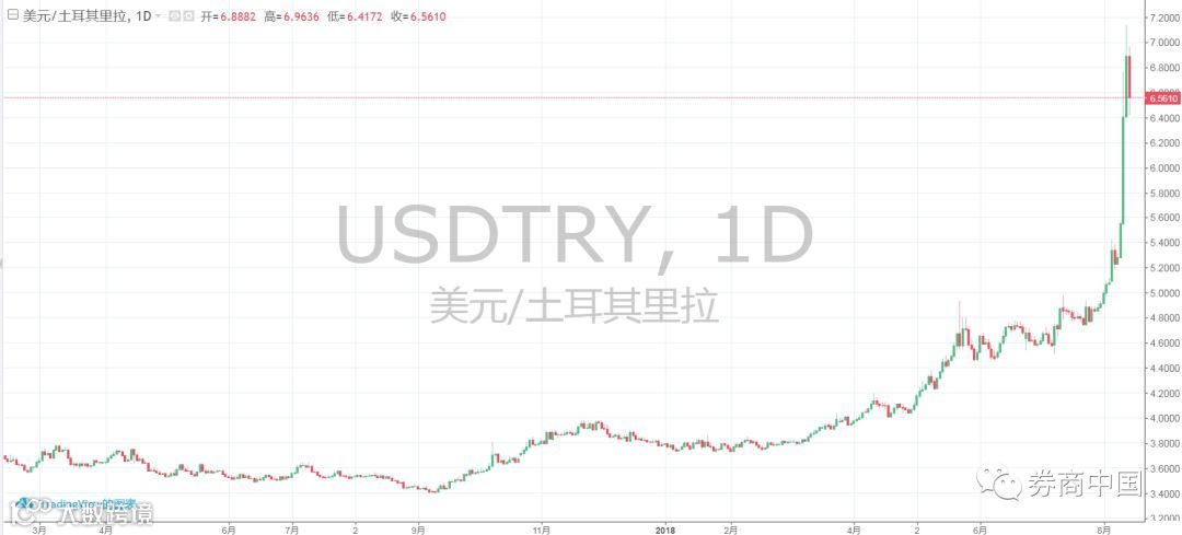 土耳其里拉到现在还没有企稳的迹象,昨天,美元兑土耳其里拉一度跌至7.1350,日内跌幅超10%,再创历史新低。今天,土耳其里拉继续低位徘徊,一度跌至6.9349,盘中也曾一度大涨约5%。8月迄今,土耳其里拉兑美元已经重挫28%。