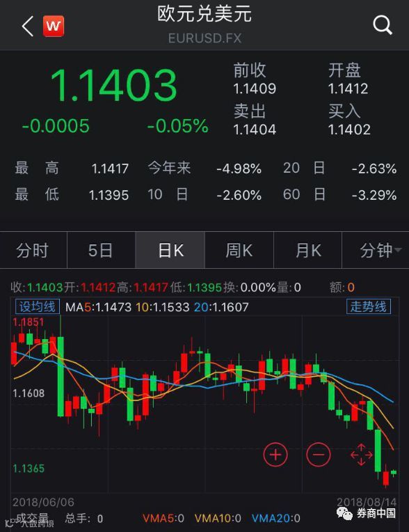 在将近三个月时间里,欧元兑美元一直在1.15至1.18美元的窄幅区间内运行,但随着里拉加速下跌,欧元兑美元汇率已经跌破这一区间,下探一年多低点1.139。