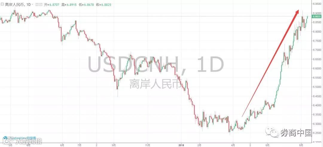 离岸人民币于4月底开始踏上贬值之路,从6.3附近一路贬至7月底的6.9,累计贬值约10%。不过,近日人民币汇率趋于稳定。