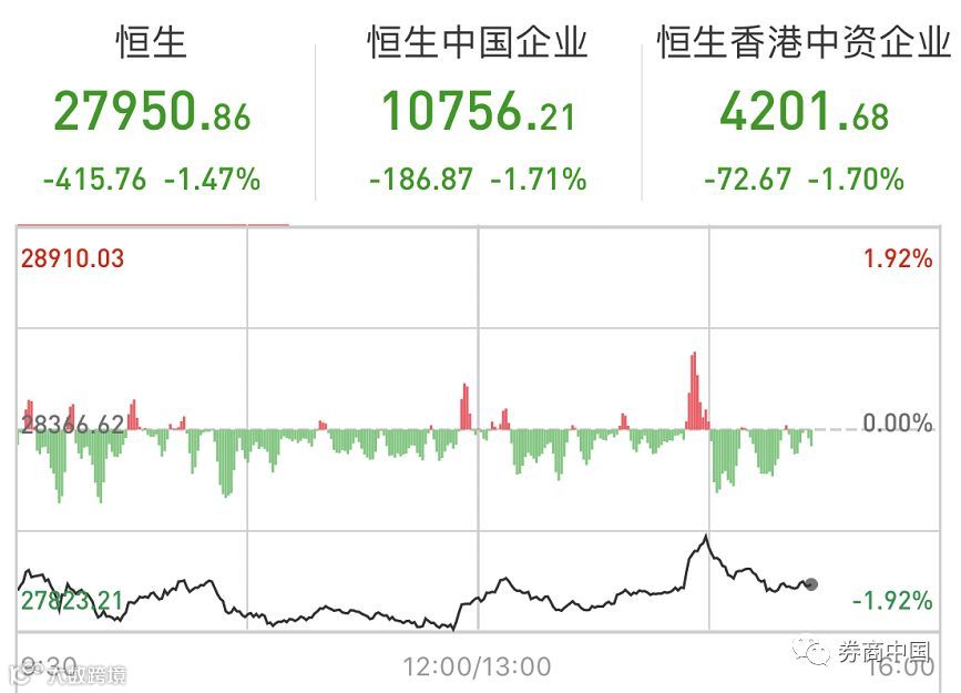先来看港股市场,恒指早盘低开1.44%,国企指数跌1.48%,红筹指数跌1.36%。截至券商中国发稿,恒指跌1.47%。