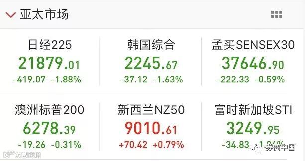 再来看亚太市场,日经225指数下跌约2%,韩国综合指数下跌1.63%,孟买SENSEX30指数下跌0.59%。