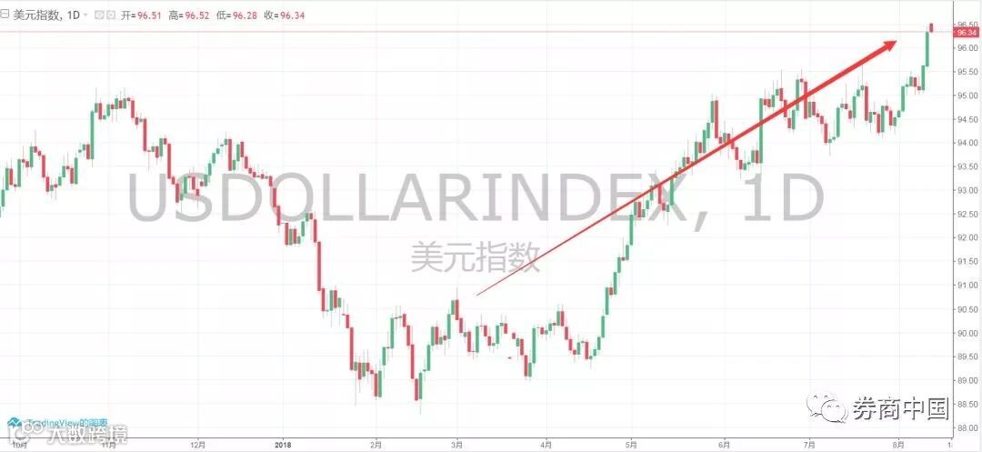 受此影响,全球汇市动荡不安,美元指数盘中再创近一年创新高,最高触及96.52,较上周五收盘价格涨幅最高近0.2%。