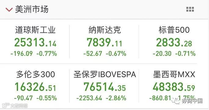 美国股市也未能独善其身,三大指数上周五表现惨淡,道指下跌0.77%,纳指下跌0.67%,标普下跌0.71%。