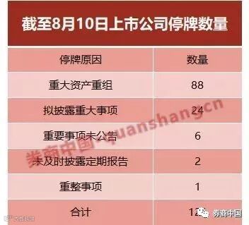 截至8月10日收盘,两市 121只停牌股中,有88家上市公司因涉及重大资产重组停牌,占比达到70.4%;有24家上市公司涉及重大事项停牌,占比为19.2%;6家上市公司因重要事项未公告而停牌,占比为4.8%。此外,还有2家未及时披露定期报告停牌,1家因重整事项停牌。