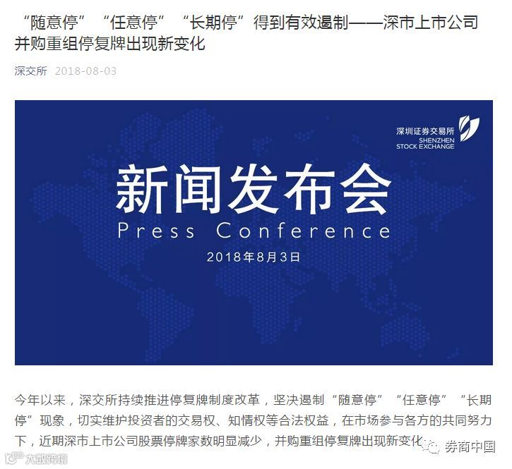 就在8月3日,深交所发布了《“随意停”“任意停”“长期停”得到有效遏制——深市上市公司并购重组停复牌出现新变化》,也对停牌事项做出了最新明确要求。