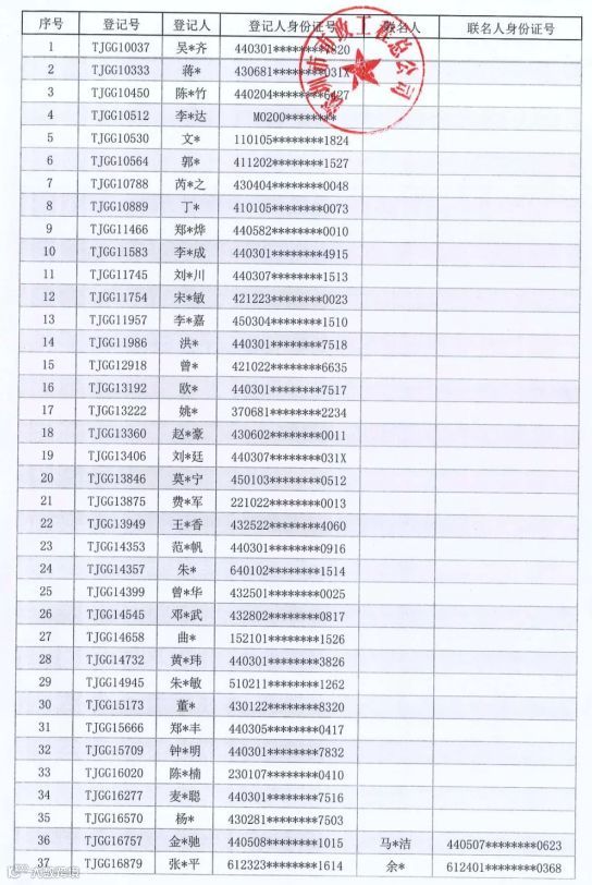 此次,天健公馆还公布了具体诚意登记人的姓名和身份证号,虽然隐去了关键信息,但是从身份证号的前几位可以判断全部诚意登记人的户籍信息。