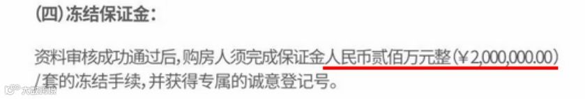 和此前热门新盘华润城、招商双玺等类似,天健公馆的购房门槛并不低,需要缴纳200万的诚意金,累计冻结诚意金总额8.72亿元。